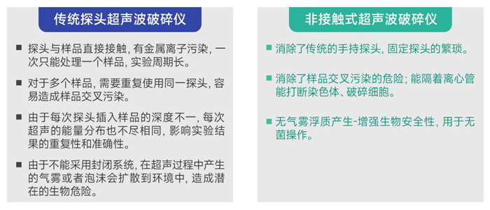 非接觸式樣品可在密閉容器下進行破碎,不產生感染性飛霧,超聲探頭與樣品不接觸,避免交叉污染。對于每天要處理多個樣品或者貴重樣品的實驗室,非接觸超聲波DNA破碎儀具有處理高通量,樣本低損耗無交叉污染等優(yōu)勢。逐漸成為ChIP(染色質免疫共沉淀)和DNA剪切研究平臺不可缺少的標準化工具。