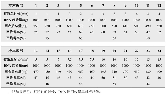 實驗結果表明:(1) 隨著打斷時間的增加,打斷片段的大小也隨之變小;(2) 相同打斷條件下,打斷效果的重復性和均一性良好。