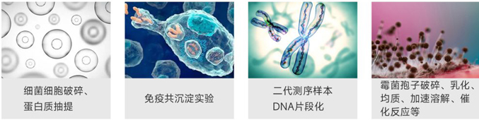 通過壓電轉換器,將電信號轉變?yōu)楦哳l聲波信號,產生數百萬的分子“空穴”,利用“空穴”在幾秒內變大、破裂產生的瞬時流體剪切力,通過等溫、非接觸的方式對樣本進行打斷、勻漿和混合。